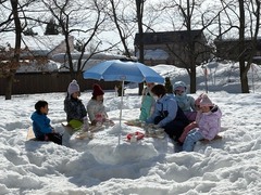園庭にたくさん積もった雪。雪山の上からそりをしたり、自分だけのかまくらを...